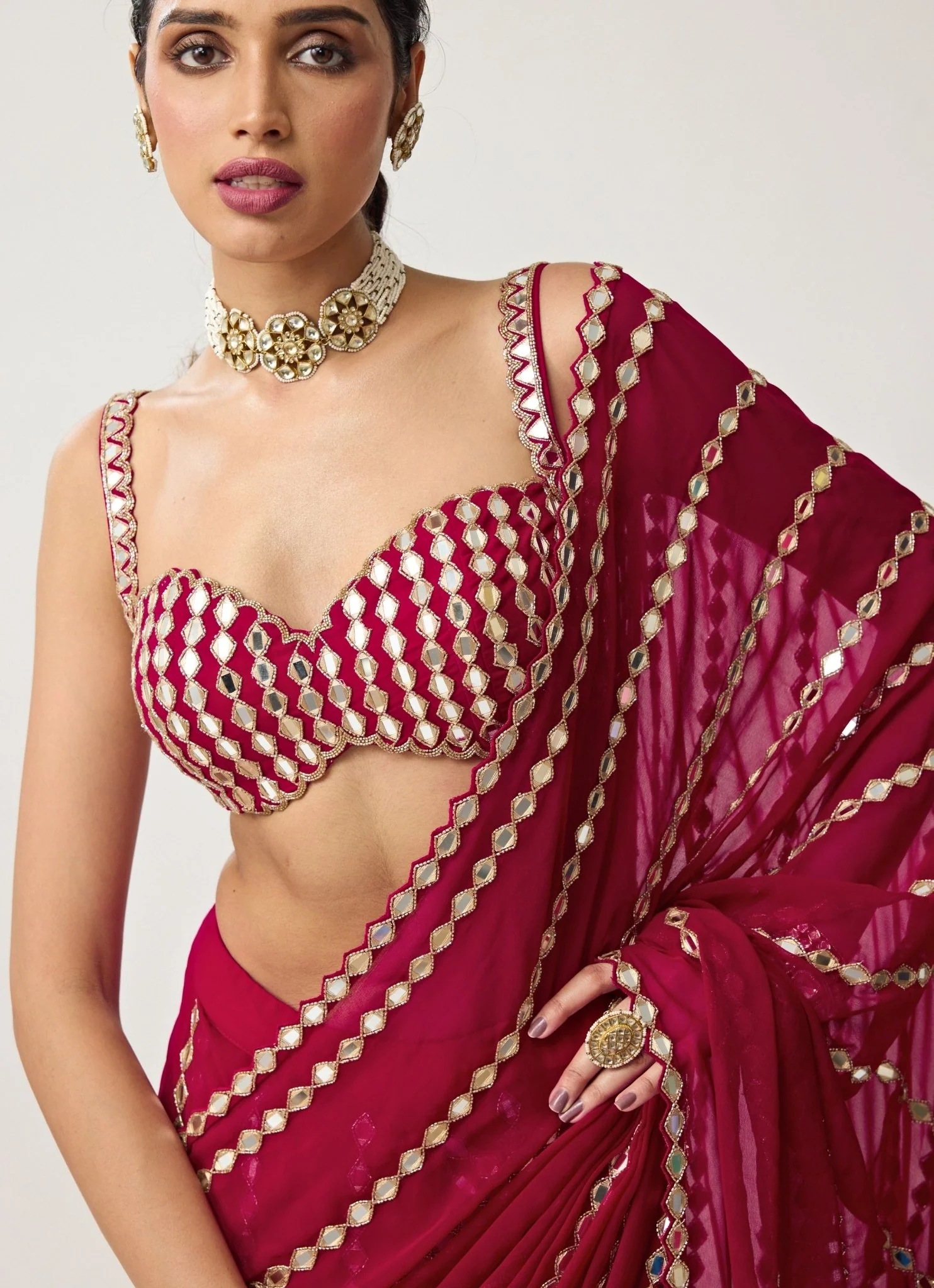 Featuring a ruby red saree in georgette base with mirror hand embroidery in linear pattern. It is paired with an embroidered sleeveless blouse. Style it with diamond earrings, a clutch bag and nude heels. Perfect for festive celebrations like Diwali, Bhai Dooj, engagement ceremonies, receptions, or cocktail nights.